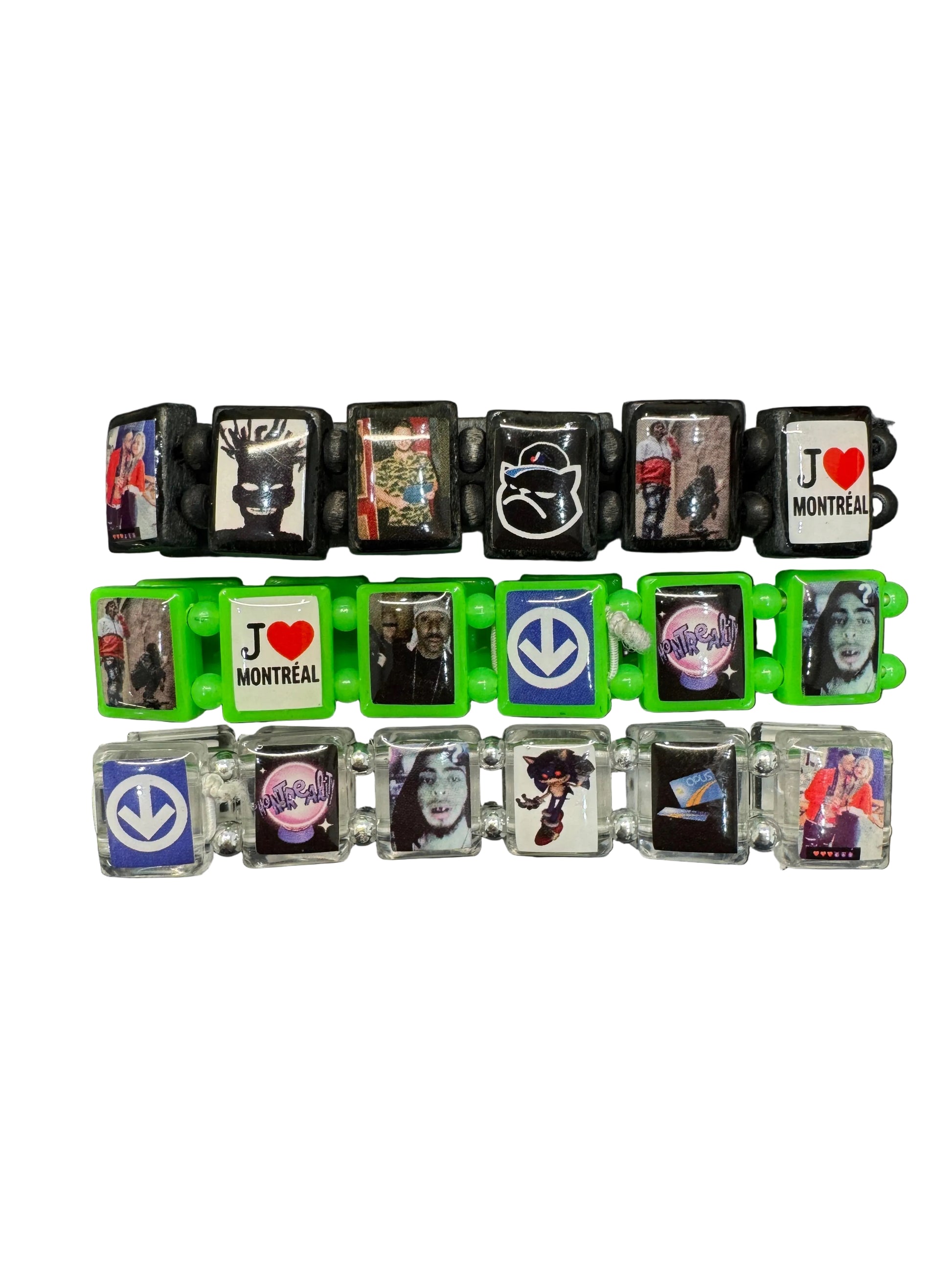 A tribute to Montreal’s underground culture and everyday symbols. This plastic and wood charm bracelet features translucent square links, each printed with iconic Montreal-inspired visuals — blending energy, nostalgia, and raw graphic.